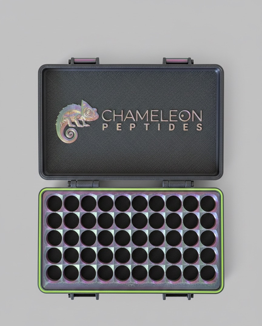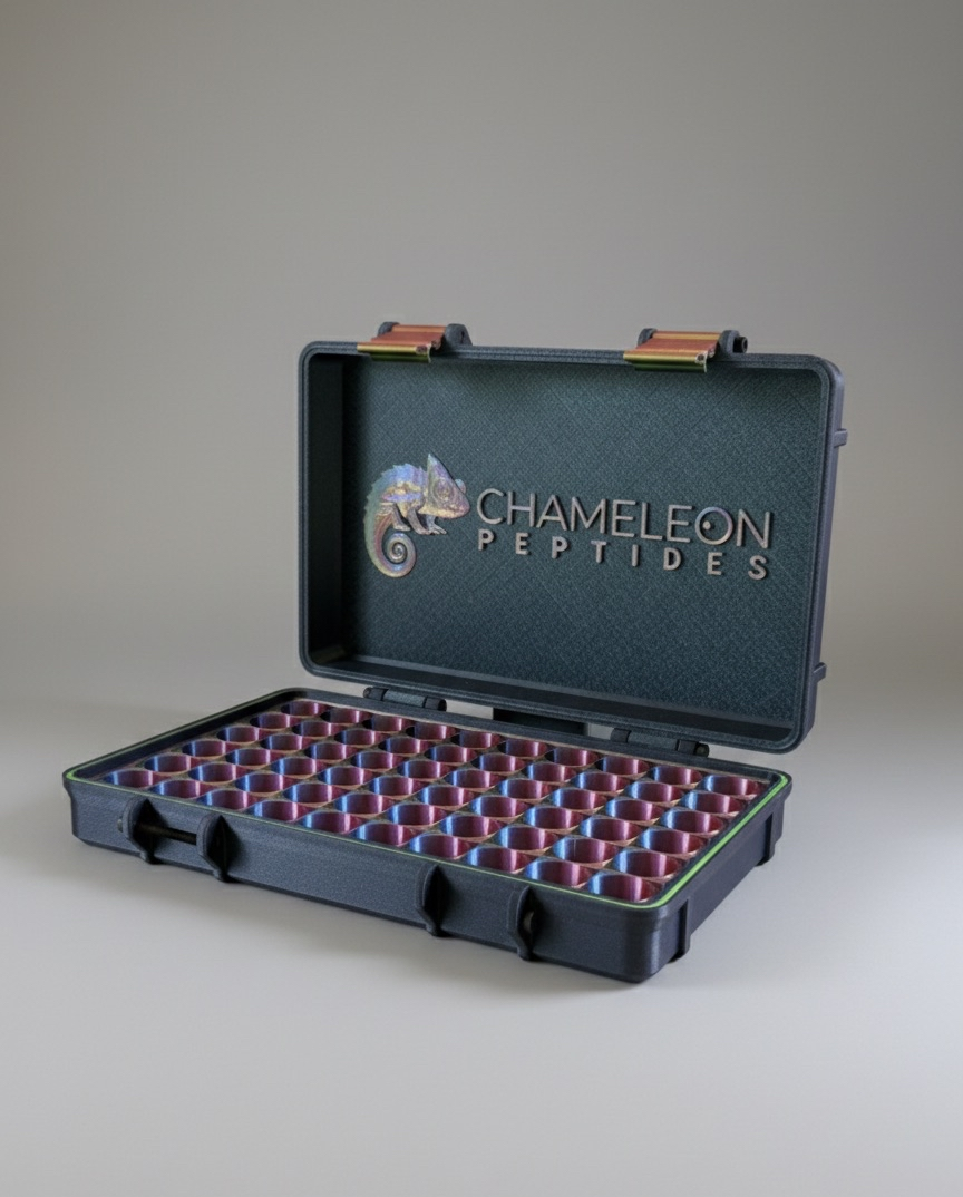 Our flagship storage case. Sixty individual compartments in a premium hard-shell enclosure. This is what proper peptide storage looks like at scale — every vial protected, organized, and accessible.